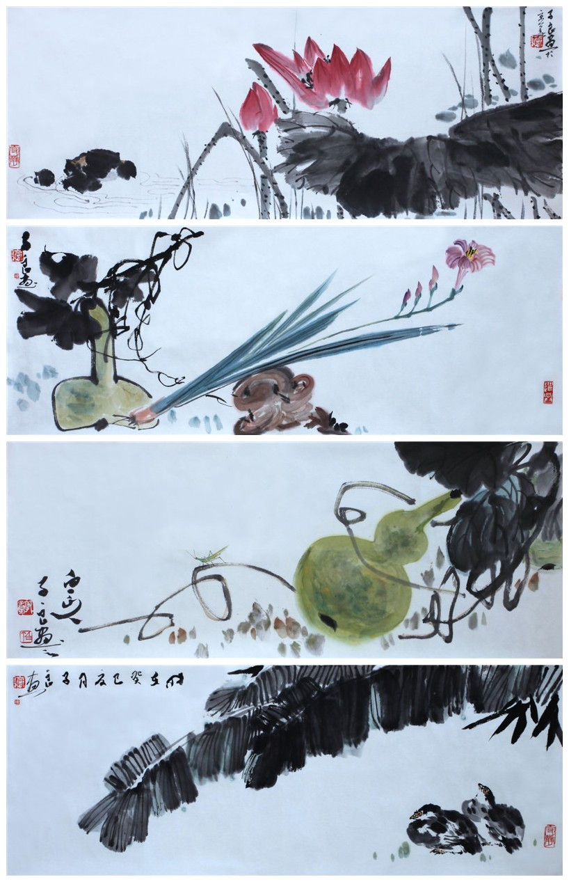 【 动态 】郭子良国画《映日荷花别样红》《美好吉祥》《秋实图》《蕉阴图》规格33cmx90cm