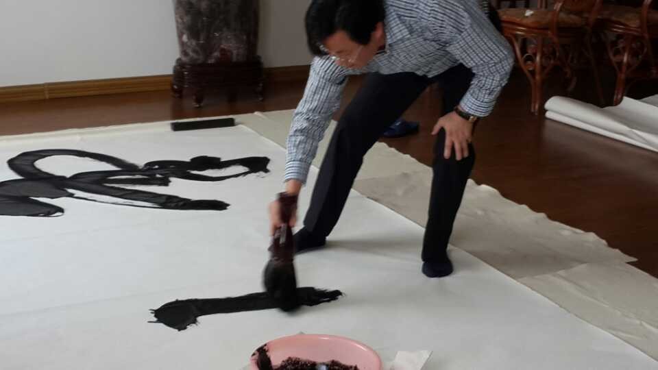 巍巍气势,当真是“气壮山河”!一直觉得如此巨幅的作品,没个三五天的绝对拿不下来。看了郭子良老师现场一气呵成这巨幅作品之后,深感自己之鄙陋。邀请郭老师做笔会的深圳老总直呼:能邀请到郭老师来做笔会,真是受益良多,收益颇丰啊!此后,硬是追着郭老师多加几场笔会,本来打算离开的郭老师,受其诚意感动,答应再做几场笔会。看到如此情景,我们甚是高兴,国人的艺术素质修养的提高意味着中华传统文化的弘扬。