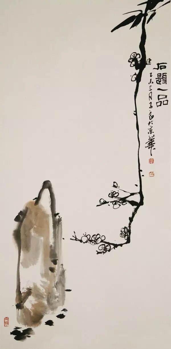 北京,文化重地琉璃厂,荣宝斋西侧中国书店画廊207室,典雅的书画工作室内,北墙垂挂着一幅抓人眼球的中堂《石题一品》,入门者无不驻足品味。