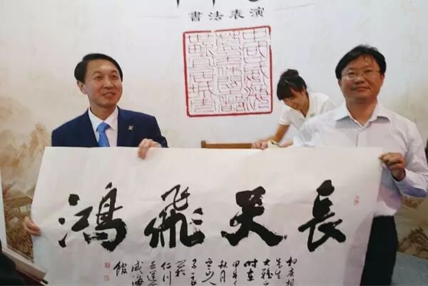 仁川亚运行郭子良先生(右一)现场创作《长天飞鸿》作为中韩文化友好往来的象征赠予仁川亚运会组委会秘书长权庆相(左一)