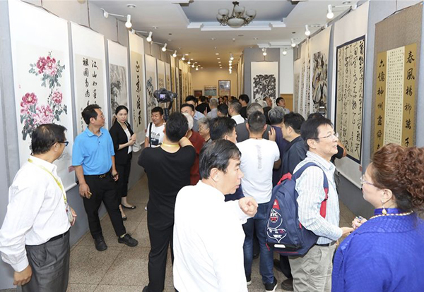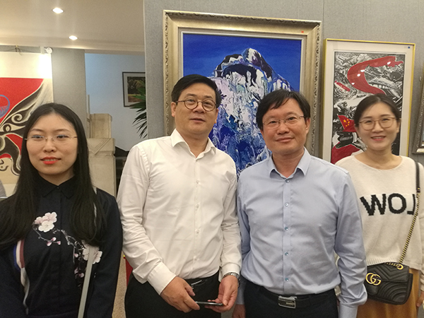中国文化管理协会书画工作委员会会长郭子良(左一)与理事计进强(右一)一同观展