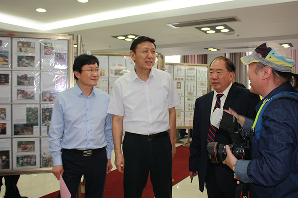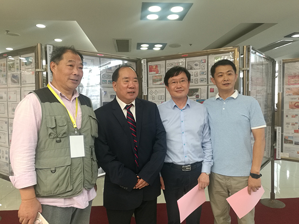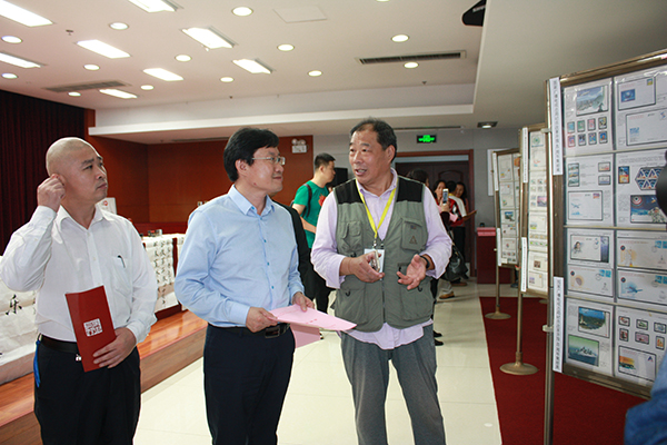中国文化管理协会书画工作委员会会长郭子良(左二)参观邮票展